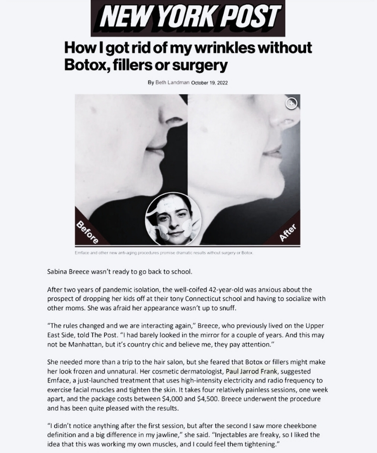 Ready to discover how EMFACE can restore a youthful profile and appearance to your lower face and neck? Contact PFRANKMD to schedule a consultation at our 5th Avenue or West Village location in NYC.